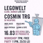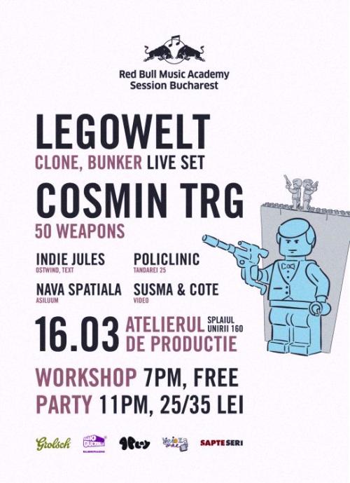 Pe 16 martie, Legowelt și Cosmin TRG, doi dintre cei mai apreciaţi producatori de muzică electronică ai Europei, vin în România pentru un workshop în cadrul Red Bull Music Academy, urmat de un party Guns N’ Lego. Li se alătură Indie Jules, Policlinic și Nava Spațială, probabil cele mai interesante proiecte românești din ultima vreme. Workshopul cu Legowelt și Cosmin TRG începe la ora 19.00 la Atelierul de Producție (Splaiul Unirii 160) și este gratuit. Intrarea la petrecerea Guns N’ Lego este 25 lei până în ora 00:00 și 35 lei după.