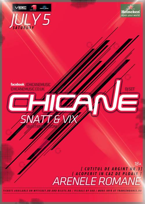 Line-up: Chicane (DJ Set), Snatt & Vix /// Data: Sâmbătă, 5 Iulie, 2014 /// Locație: Arenele Romane (în Parcul Carol), str. Cuțitul de Argint nr. 3 /// Locația este de tip “open air” dar acoperită dacă plouă!!!