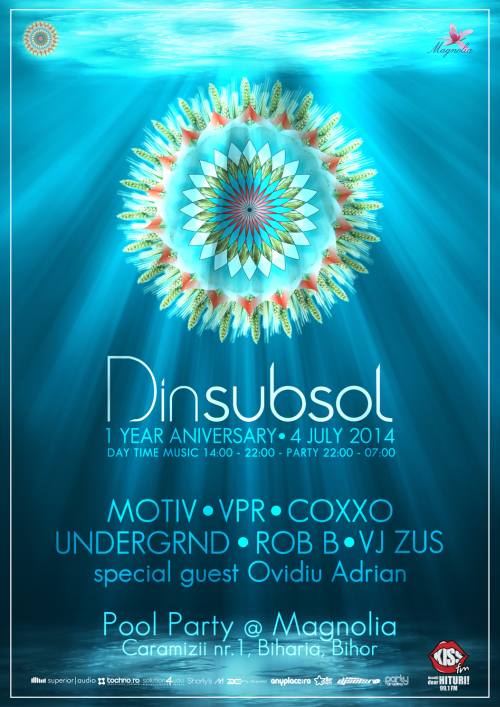 După câteva evenimentele care au fost promițătoare pentru echipa. Dinsubsol am ajuns să sărbătorim un an de la momentul în care ne-am adunat să formam acest proiect, speram să ne adunam și mai multi în anul care urmează, pe aceasta cale am considerat că acest eveniment e bine să-l facem cu întreaga echipă iar varianta cu dj-ii invitați să o păstram pentru luna septembrie când vom continua evenimentele cu invitați valoroși pentru muzica techno din Romania. Mulțumim pentru susținere și încredere, sperăm ca la acest eveniment să ne adunam în număr cât mai mare, să petrecem înainte de concedii și vacante. Am ales de aceasta data să ieșim afara, la piscina complexului Pensiunea Magnolia din Biharia care ne-a oferit aceasta oportunitate pe data de 4 iulie de la ora 14.00 pana dimineața la 7:00.