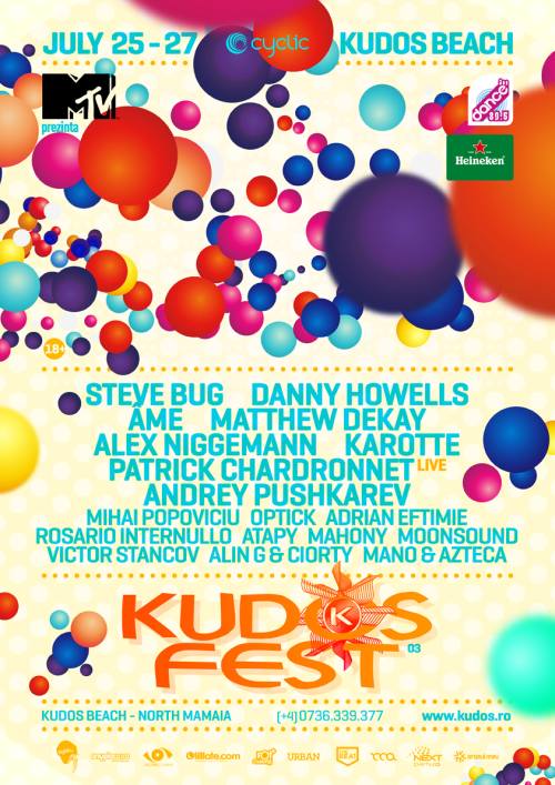 Desfășurat între 25 și 27 iulie, Kudos Fest e un răsfăț binemeritat pentru cei care revin de peste 12 ani să se bucure de cea mai cunoscută plajă de party din România, de cei mai buni DJ, și de soarele care cel mai adesea spune prezent cu tărie. La a treia ediție, unul din cele mai consistente festivaluri de muzica electronica își va da testul de maturitate susținut de un line up senzațional, format din nume cu portofolii impresionante atât de gig-uri cât și de rezidențe. Muzica incredibilă, aleasă special pentru a îmbrăca în culori unice spiritul trend setter-ului Kudos Beach.