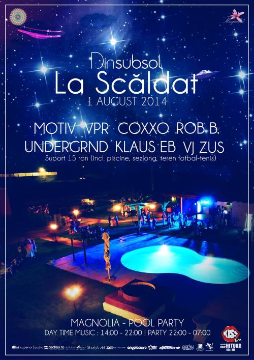 După feedback-ul pozitiv de la ultimul eveniment Dinsubsol , ne vom reîntâlni pe 1 august tot la piscina Magnolia de la Biharia. Pentru că suntem în plin sezon de vara, am decis să mai facem încă un eveniment la piscina, fiind și perioada de concedii, iar de data aceasta am suplimentat sunetul și luminile, am păstrat lineup-ul la fel adăugându-l pe Klaus EB pentru a diversifica programul de zi cu deep & soulful house, deep-funk, nu-disco. Ne vedem pe 1 august La Scăldat !