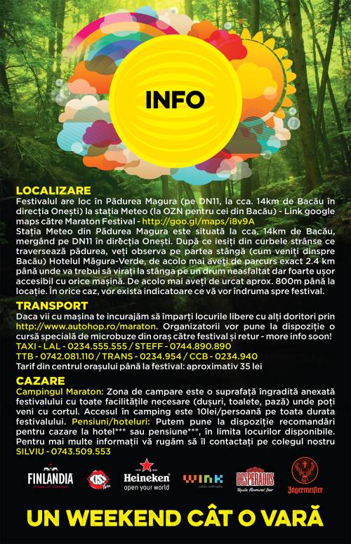 The festival takes place în Magura Forest (on DN11, approx. 14km from Bacau to Onesti direction) at the Weather Station. Link to Google Maps Maraton Festival – goo.gl/maps/i8v9A