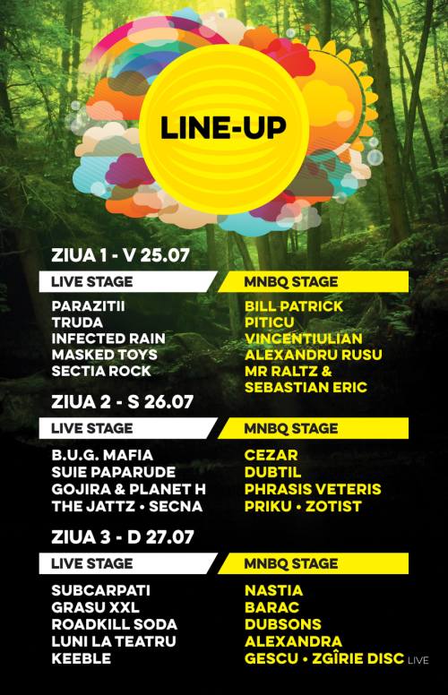 Peste 40 de artisti de muzica electronica, rock alternativ și hip-hop se vor desfasura în cele 3 zile ale festivalului, iar alaturi de muzica servim toate ingredientele unui festival – food court, camping, sport & lounge area, arts & crafts, expozitii de fotografie și alte picanterii de pierdut vremea cu frumosul.
