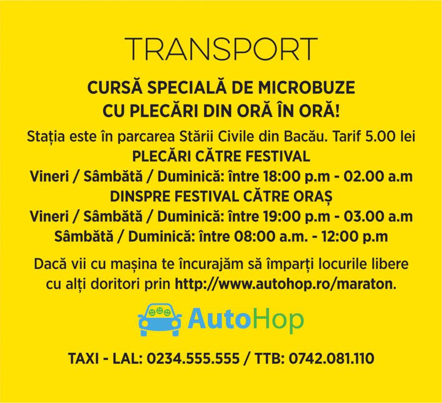 Organizatorii vor pune la dispoziție o cursă specială de microbuze din oraș către festival și retur – mai multe informații în curând.