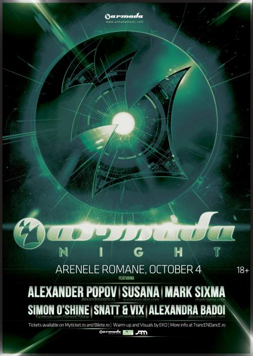 ARMADA NIGHT și al său concept LIVE (show nu doar cu DJs ci și cu vocaliști) revine în România pentru a doua oară în acest an, pe 4 octombrie la Arenele Romane. După succesul răsunător din luna aprilie a acestui an, atunci când invitații speciali au fost Aly & Fila (Egipt) și Christina Novelli (Marea Britanie), Armada Music, labelul lui Armin Van Buuren, se întoarce la publicul din Romania! De data aceasta, artiștii invitați speciali sunt în număr și mai mare, ei reprezentând valul nou de producători / dj de trance & progressive, dar și 2 vocaliste de excepție; veți avea parte de o noapte cum rar se întâmplă chiar și în afara țării noastre: Armada Night LIVE cu Alexander Popov (Rusia), Susana (Olanda), Mark Sixma (Olanda), Simon O’Shine (Polonia), Snatt & Vix și Alexandra Badoi.