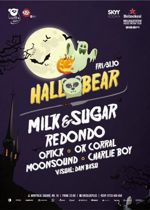 Pe 31 octombrie, ursul de pluş te invită să-ţi pui costumul şi să te alături distracţiei. Alături de noi, în premieră în România, Mike ‘Milk’ Kronenberger şi Steven ‘Sugar’ Harding aka Milk&Sugar îmbracă bavarez muzica house. Aflaţi în turneu cu House Nation, cei doi aduc piese dragi vouă precum „Canto del Pilon“ şi “Let the Sun Shine”, cât timp băieţii de la Redondo, Freek Geuze şi Johan Jacobse pregătesc tech house de la Amsterdam, cu promisiunea de a vă sălta cadenţat trupurile. Printre ei și gașca Teddy Bear – Optick, OK Corral, Moonsound și Charlie Boy ține isonul în stil deep, funky şi nu-disco, astfel ca tu să poți defila în pași de dans bine punctați.