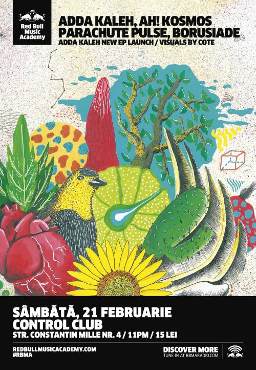 Cea de-a doua seară Red Bull Music Academy (sâmbătă, 21 februarie) este dedicata lansării noului EP semnat Adda Kaleh și are ca invitate talentate artiste și producătoare care abordează zona DIY pentru un alt fel de reconstrucție a identității muzicale. Adda Kaleh, Parachute Pulse și Ah! Kosmos (Istanbul) sunt toate absolvente ale Red Bull Music Academy și voci unice ale unui ethos alt/left fie ca explorează ritmuri organice și subtile (Adda Kaleh), complexe lumi poliritmice (Ah!Kosmos) sau beaturi atmosferice impecabil și imaculat construite (Parachute Pulse).