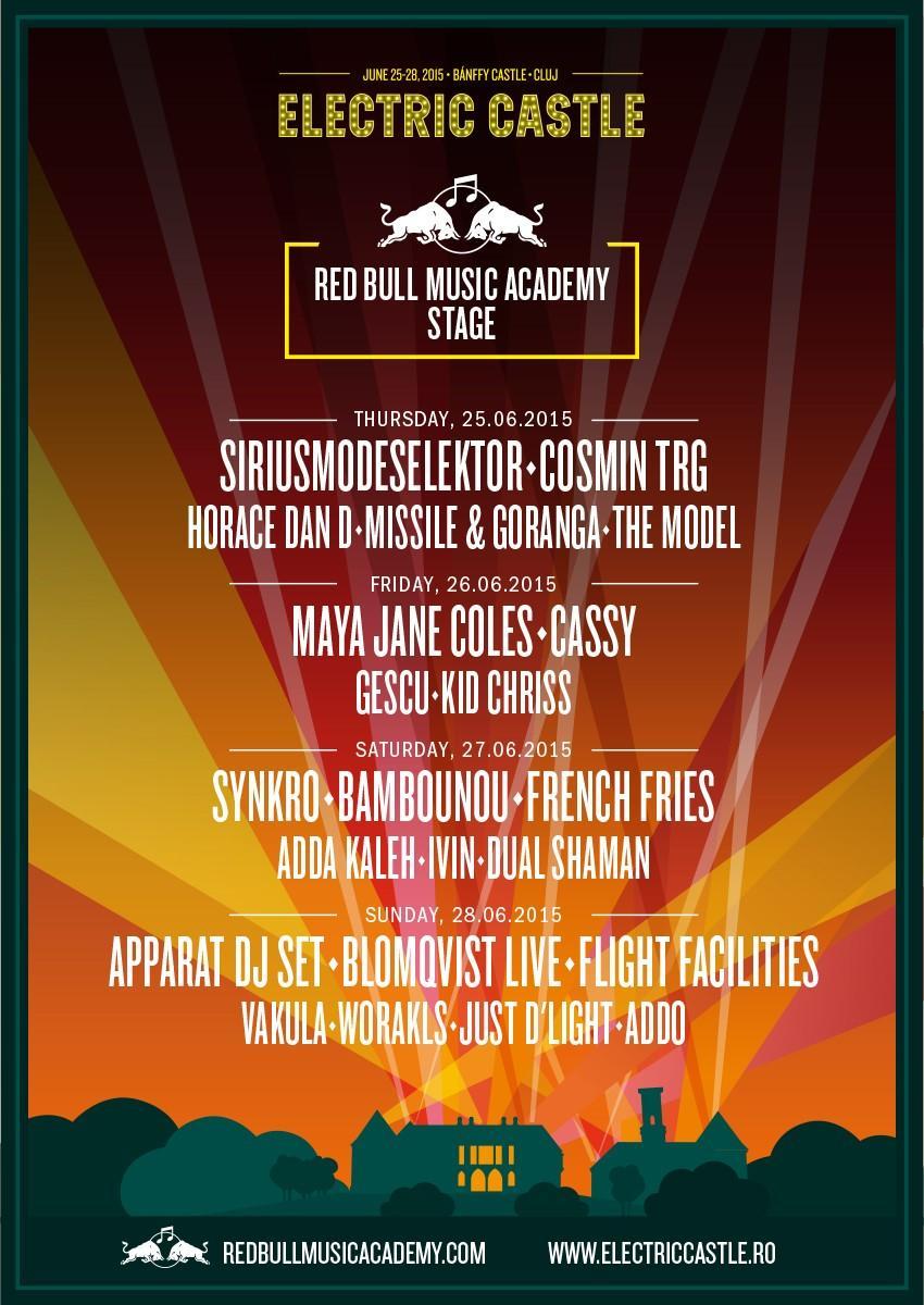 Pe scena Red Bull Music Academy de la Electric Castle vor urca artiști precum Siriusmodeselektor, pentru prima oara în Romania în aceasta formula, Cosmin TRG si Adda Kaleh, dar și Bambounou, French Fries, Apparat sau Vakula.